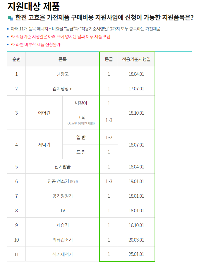 - 지원 대상 제품 확인 (에너지공단 등급제도 홈페이지 참조)