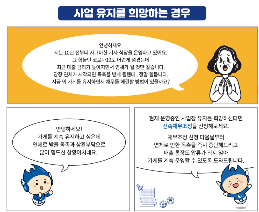 무엇보다도 ‘소상공인 119 플러스’는 단순히 채무를 조정하는 것을 넘어, 신용 등급 하락을 최소화하고 폐업이나 부도 등의 위기를 미연에 방지하는 것을 목표로 하고 있습니다.